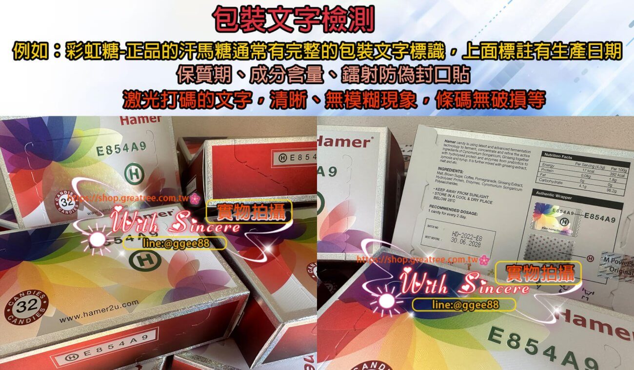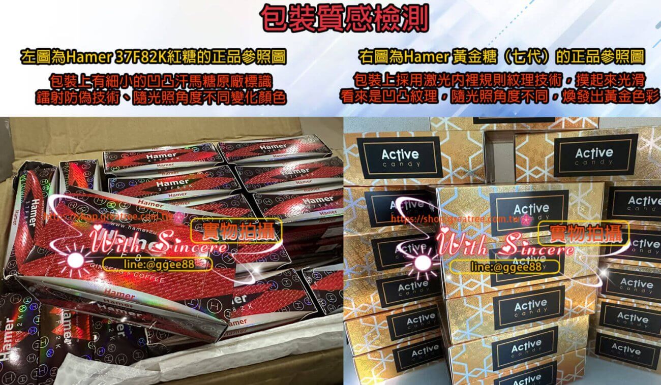 辨別汗馬糖真偽時,包裝質感是一個關鍵指標。以正品 Hamer 紅糖(批號示例 37F82K)為例,其外盒正、反、側面皆採用全版雷射工藝,在燈光下呈現自然流動的彩虹折射效果,邊緣收口平整服貼,無翹邊或氣泡;盒身紙板厚實、結構硬挺,表面觸感細膩且具清晰的凹凸紋理。印刷品質方面,正品字體銳利清晰、無暈墨與錯字,條碼可正常掃描,批號與效期標示平直規整、不易刮落,位置一致且無貼紙覆蓋。外膜封口緊實、無皺褶或二次封裝痕跡;拆封後的小包裝切邊對稱、印字與外盒一致,批次統一。