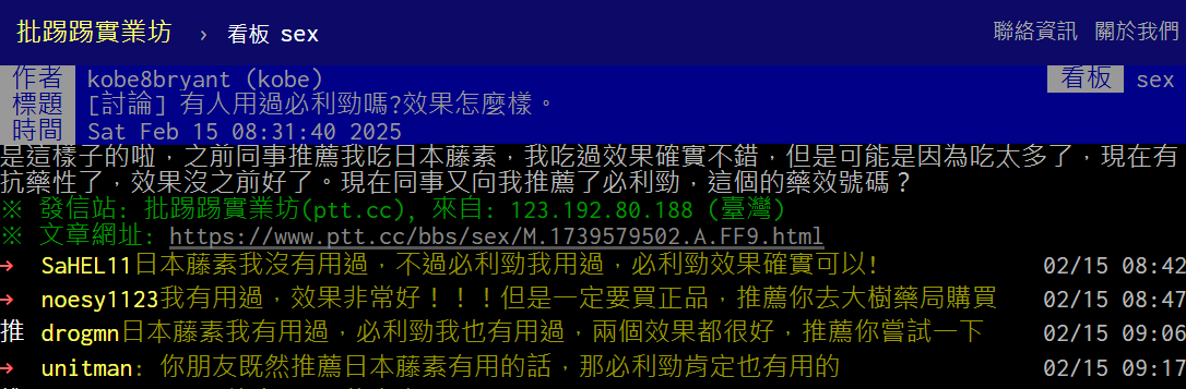 在 PTT MenTalk、sex 版與 Disp BBS 等男性論壇上,必利勁效果好嗎?」、「真的能延時嗎?」 一直是熱門討論話題。我們彙整多篇實際使用者回應,幫助你更全面了解這款早洩治療藥物的實際效果。