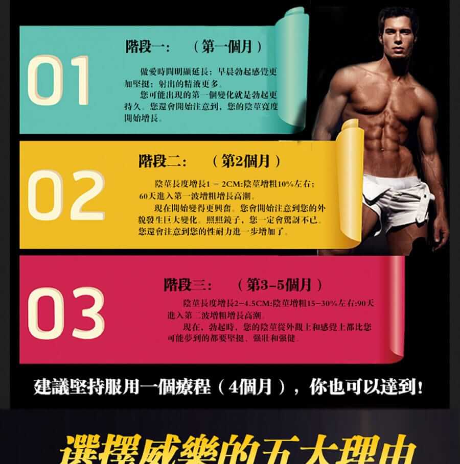 | 第3~5個月 | 性功能全面強化,進入增粗增長第二階段,增長2 |